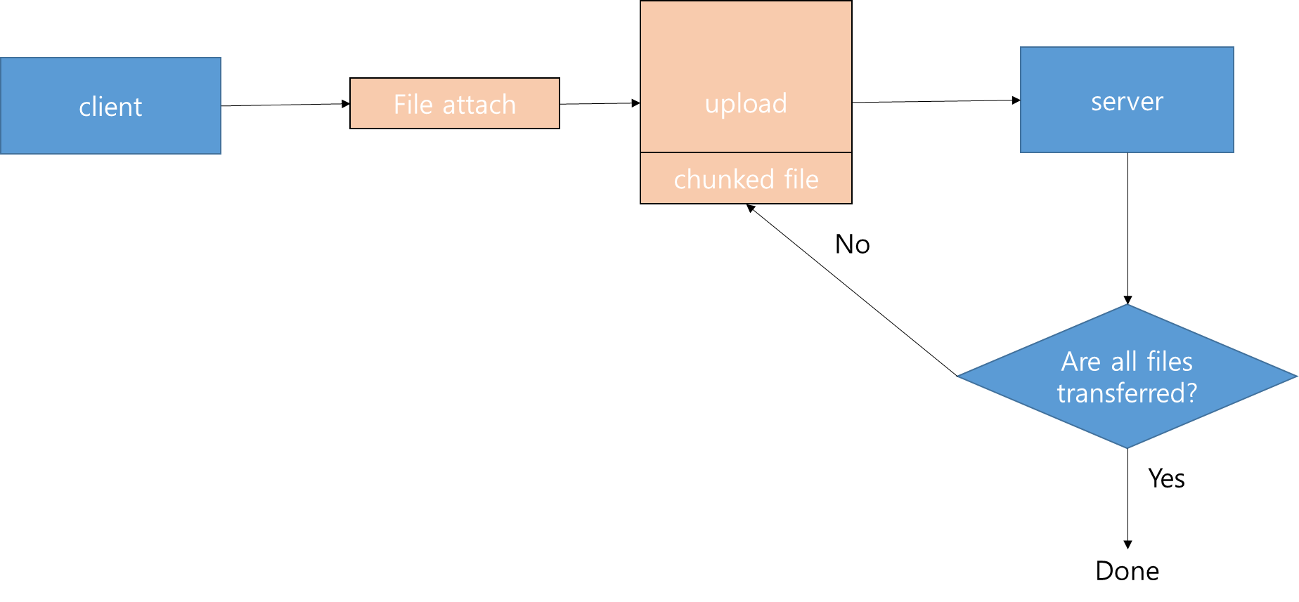 요구 사항은 client에서 ajax를 통해서 대용량 첨부파일을 업로드하는 것이었다. 서버에서 업로드하는 용량이 제한되어 있거나, request를 보내고나서 오랜시간 사용자가 멈춰있는게 문제가 되므로 파일을 분리하여 ajax로 구현을 진행했다.